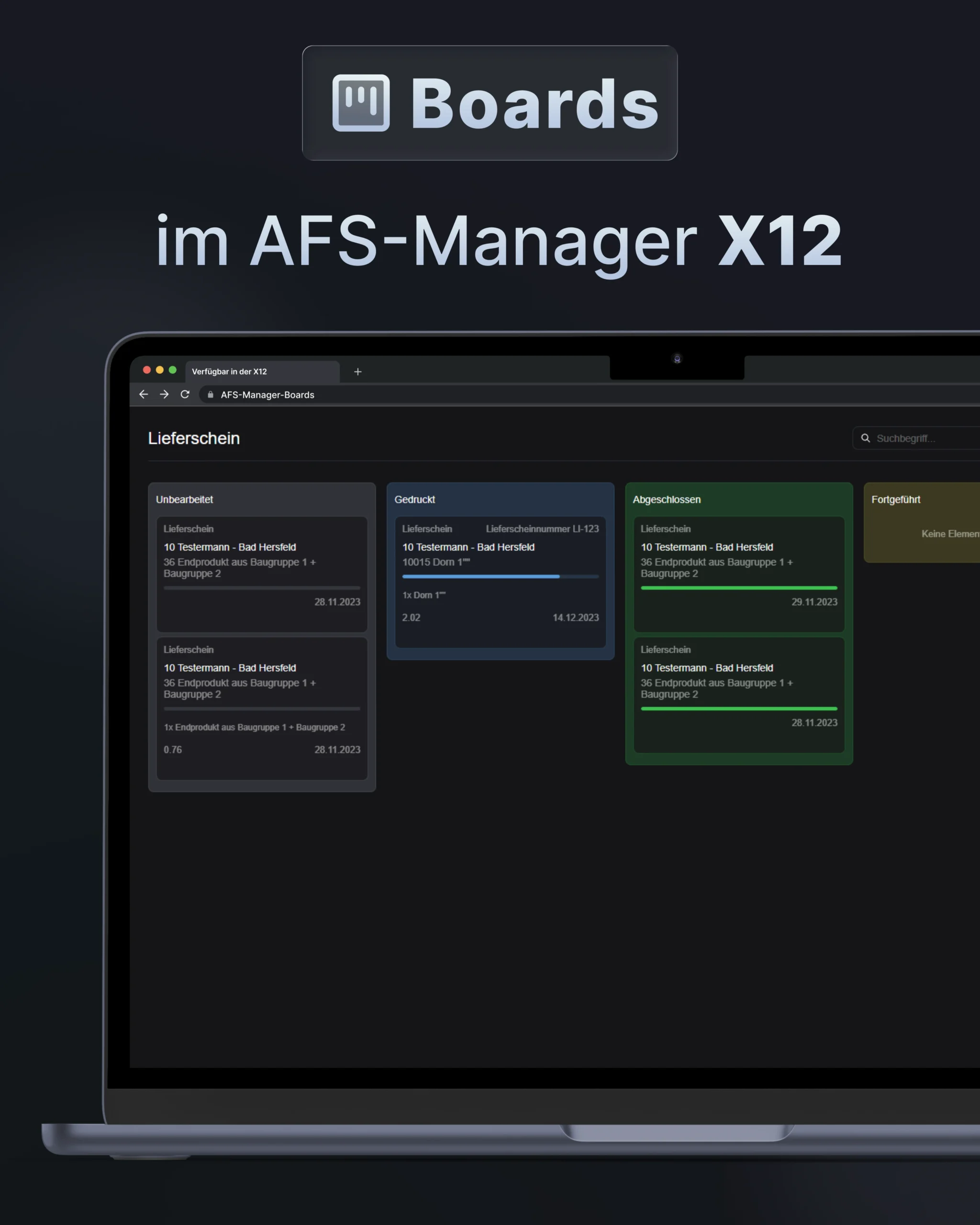 Effizienz beginnt mit Übersicht. Mit der kommenden Version X12 des AFS-Managers erweitern wir Ihre Möglichkeiten: Die neuen Boardansichten bieten Ihnen eine moderne, visuelle Alternative zur klassischen Listendarstellung – für mehr Transparenz in Ihren täglichen Abläufen.